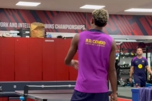 亚马尔社媒晒训练之余与科亨进行乒乓球对决的视频,这位巴萨边锋占据上风,他配文调侃:“我的儿子(甜心)。”