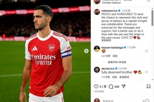 梅里诺写道:“自豪与荣幸!今晚能有机会作为队长代表这家俱乐部和这群球员出战,感觉难以置信。感谢所有人的留言和支持,没有比用一场胜利和晋级下一轮更好的方式来庆祝了,枪手加油!🤍❤️💪🏽”