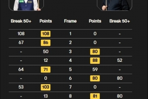 全场比赛,斯蒂芬-马奎尔打出五杆50+(52、80、80、66、96),江俊打出一杆108分和四杆50+(67、64、53、58)