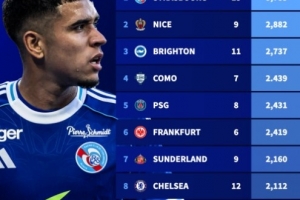 五大联赛U21出场时间排行:斯特拉斯堡以5785分钟高居榜首