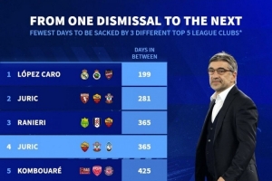 本世纪五大联赛教练最短时间被三家俱乐部解雇排名: