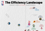 横轴代表进攻效率,越靠右越好,纵轴代表防守效率,越靠上越强。第一象限的球队多为发挥出色的球队,而在第三象限的球队通常为战绩比较糟糕的球队。