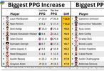 场均得分比上赛季增涨最多和下降最多的十名球员,里夫斯目前场均得分28.1,比上赛季高了7.9分。