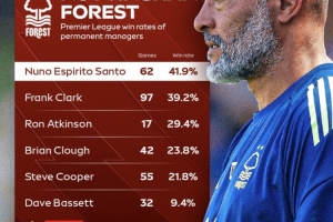 根据数据统计,努诺是森林队史英超胜率最高的主帅。努诺率队出战62场英超比赛,胜率达到了41.9%。上赛季努诺率队拿下英超第7,获得欧联杯资格。